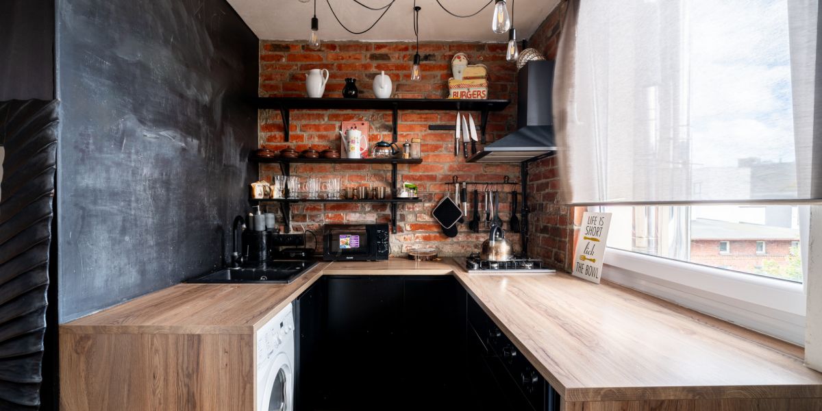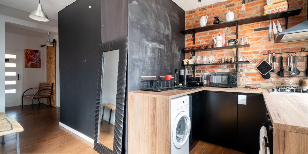 salon z aneksem kuchennym w stylu industrialnym - ceglana ściana, drewniane akcenty, nowoczesne oświetlenie, w pełni wyposażona kuchnia,