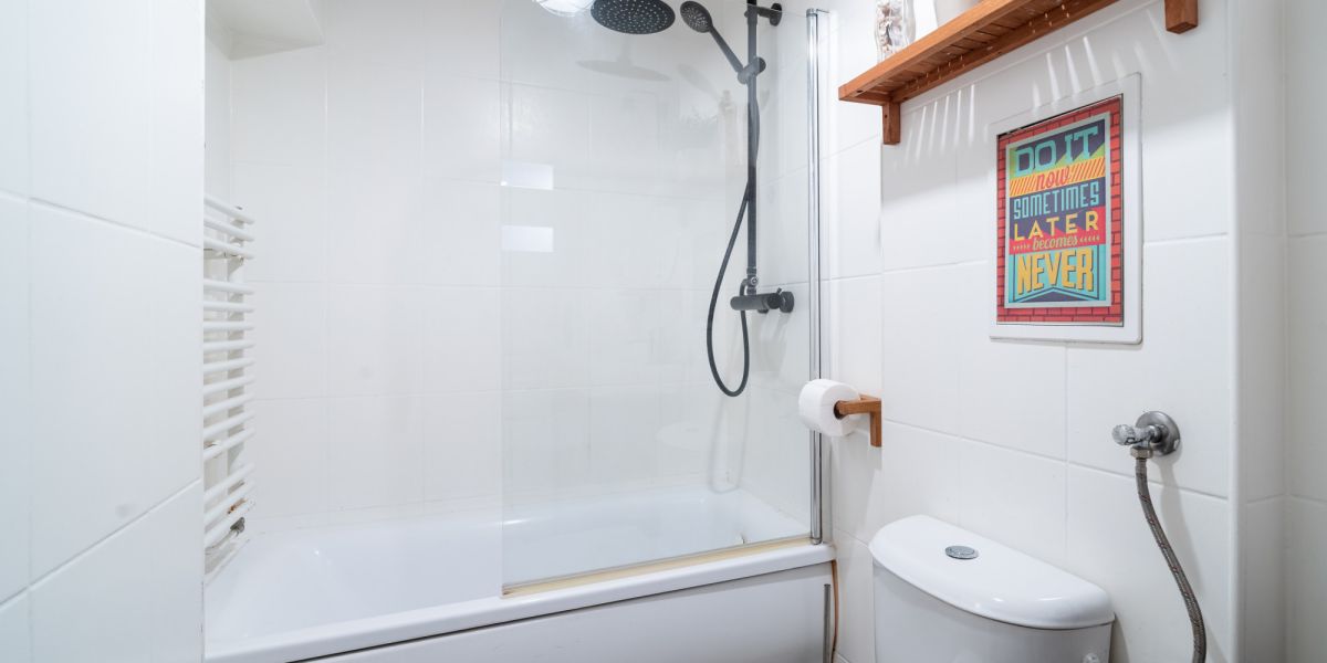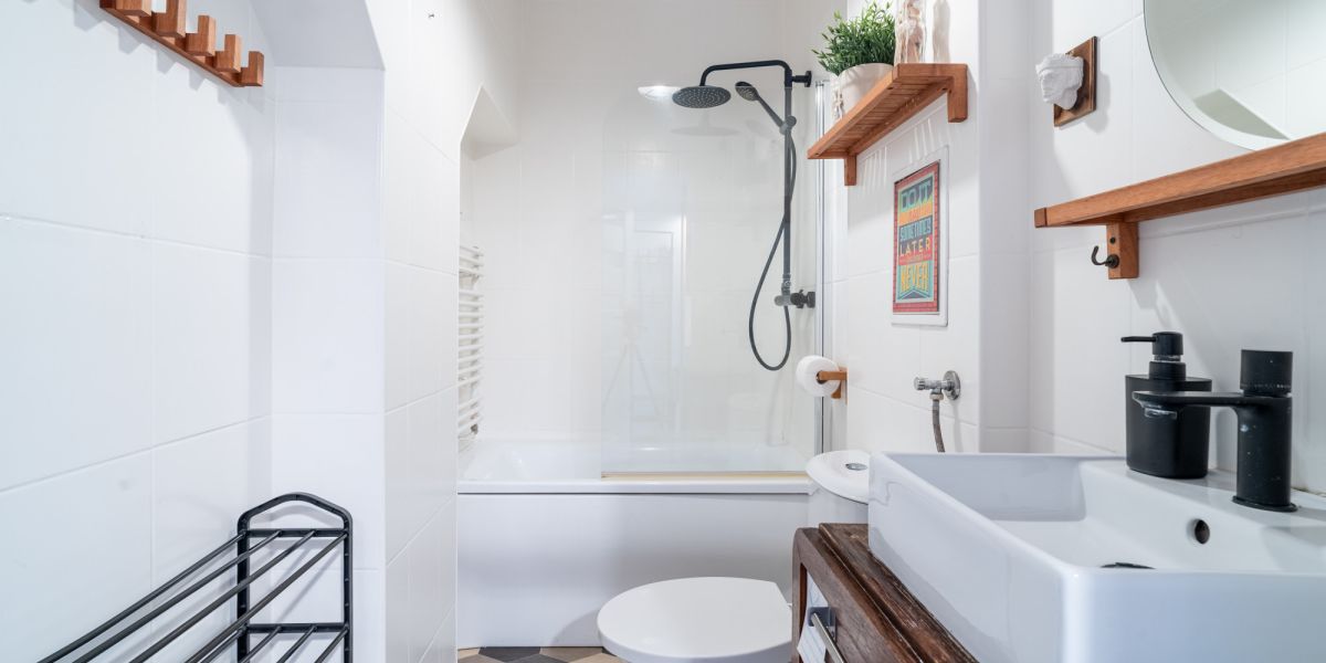 łazienka z wanną, przesłoną prysznicową i deszczownicą, wykończona w jasnej kolorystyce z elementami drewna,