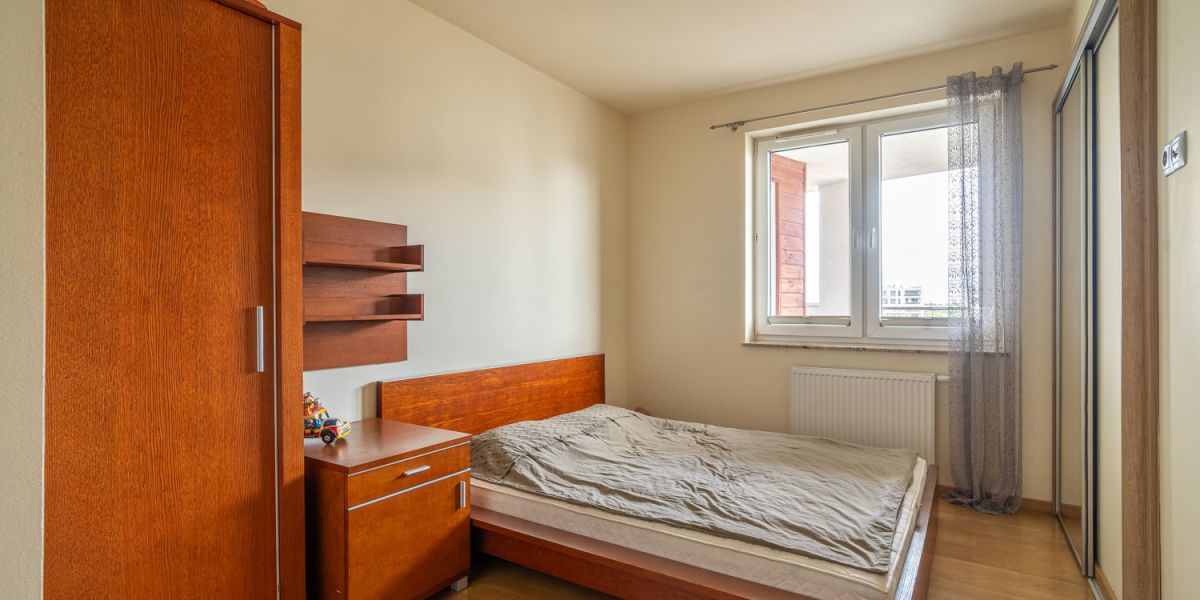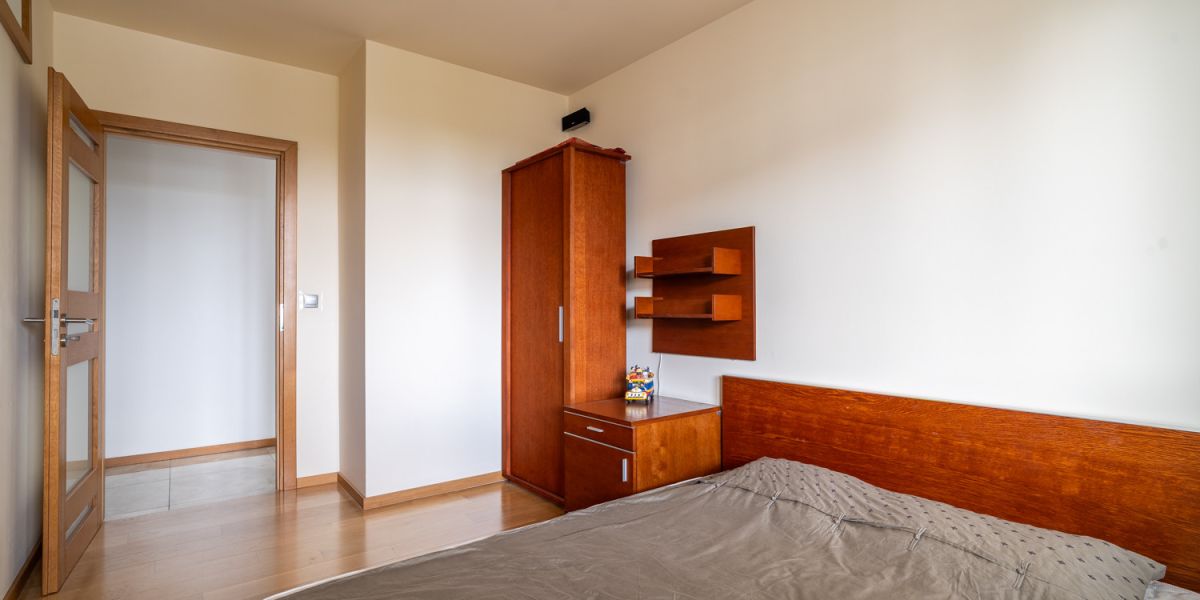 Sypialnia z dużym łóżkiem, pojemną szafą oraz oddzielną garderobą,