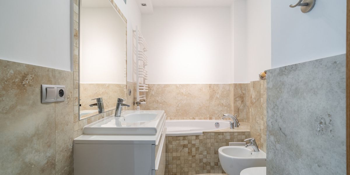 Łazienka z wanną, utrzymana w stonowanych kolorach bieli i beżu,