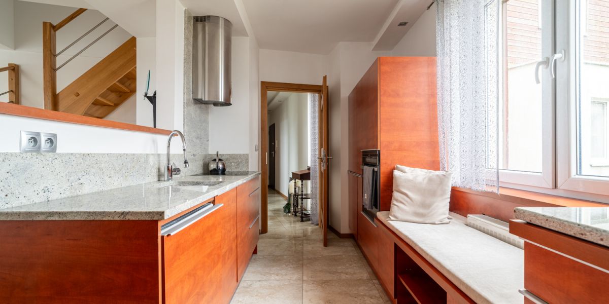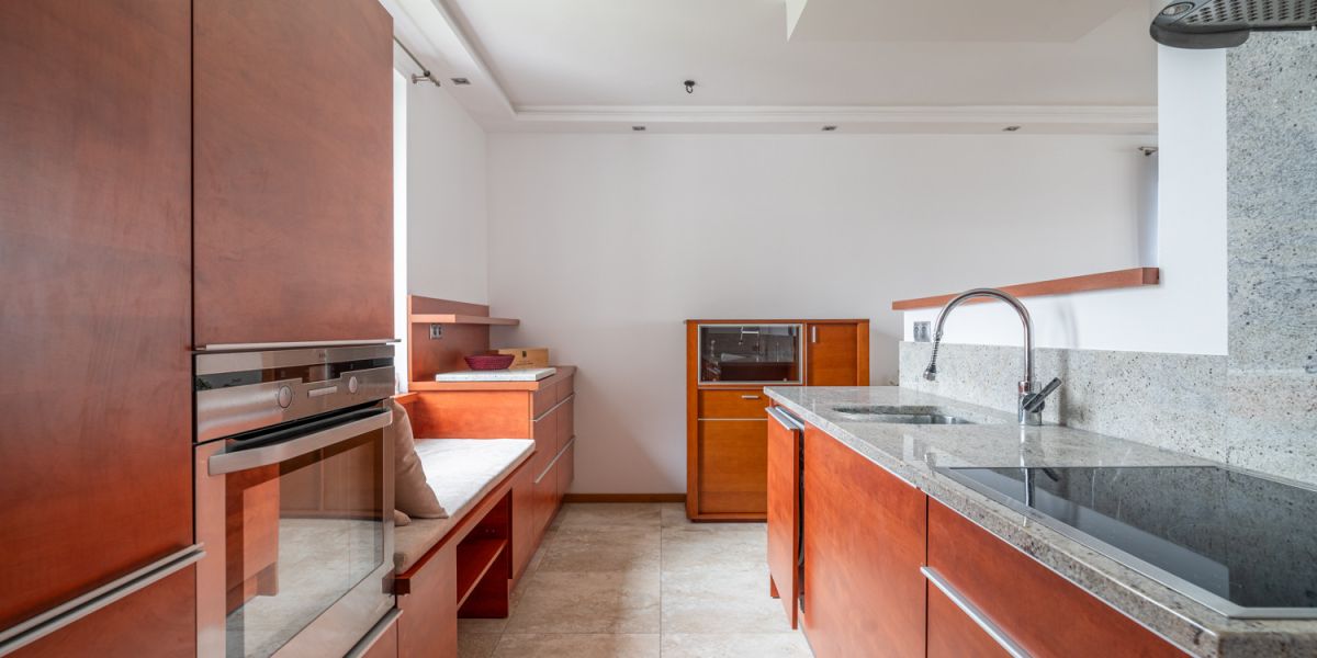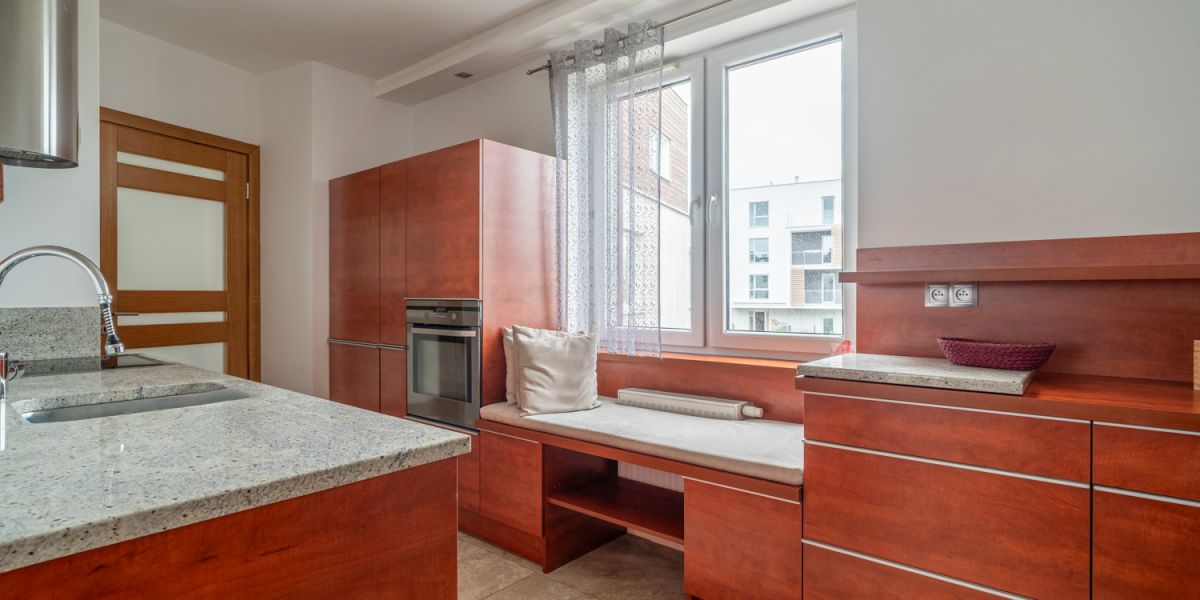 W pełni wyposażona kuchnia w klasycznym stylu - fronty w kolorze czereśniowego drewna,