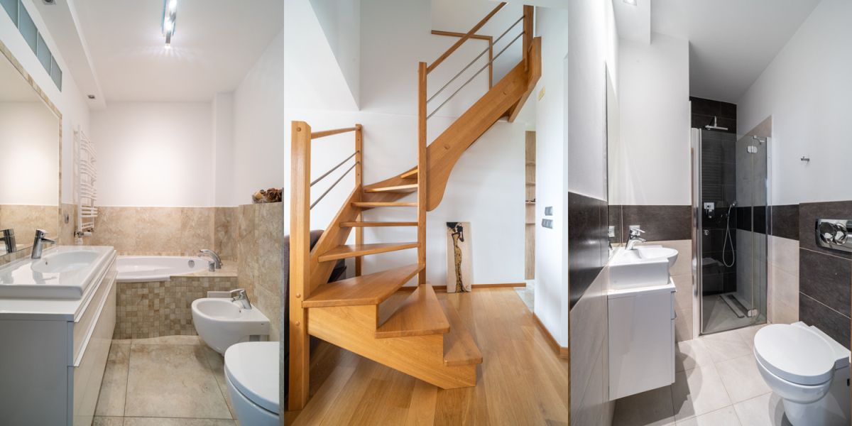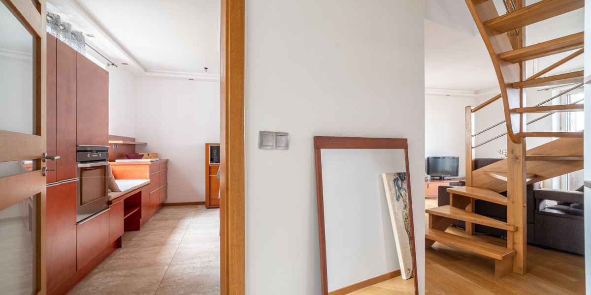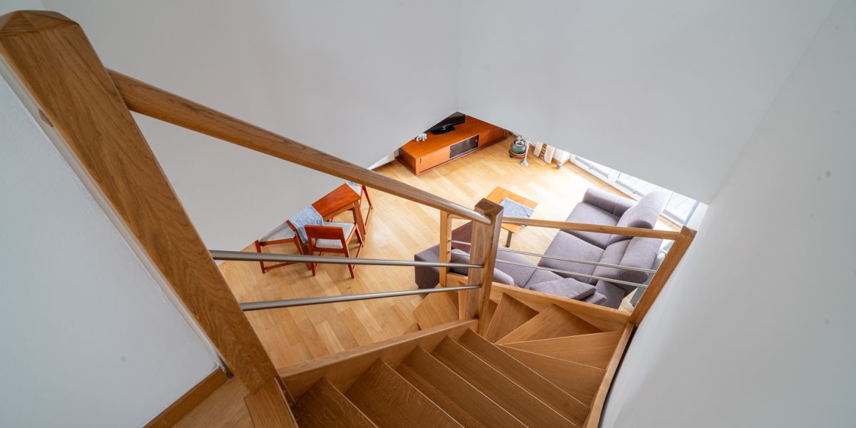 Dębowa podłoga oraz solidne dębowe schody prowadzące na drugi poziom.