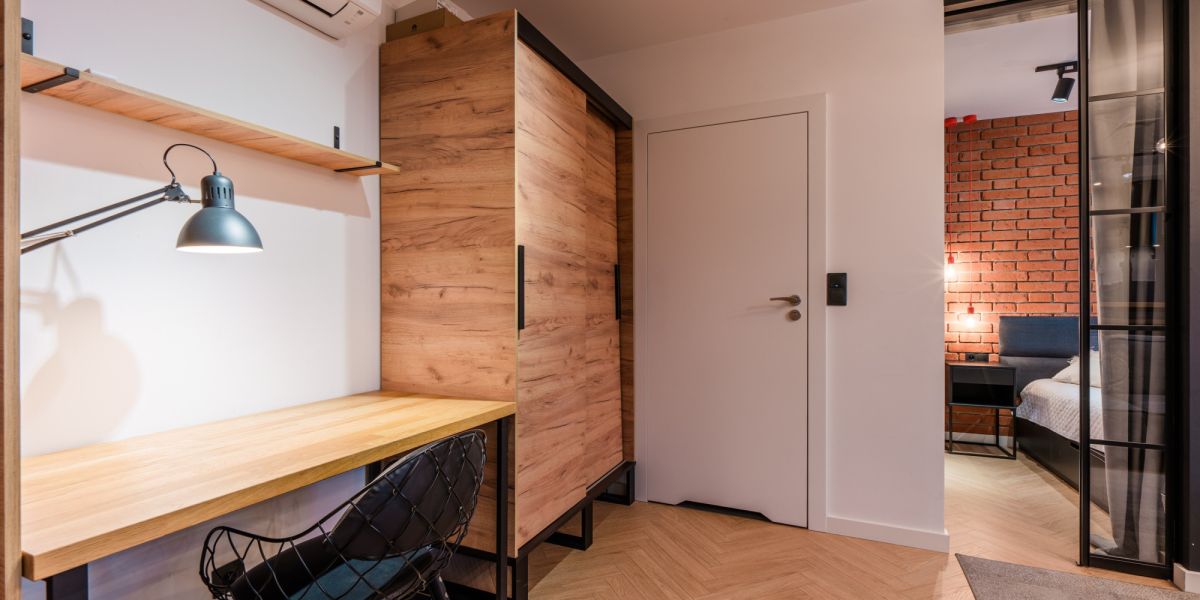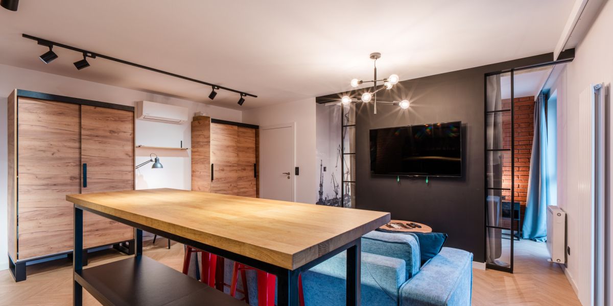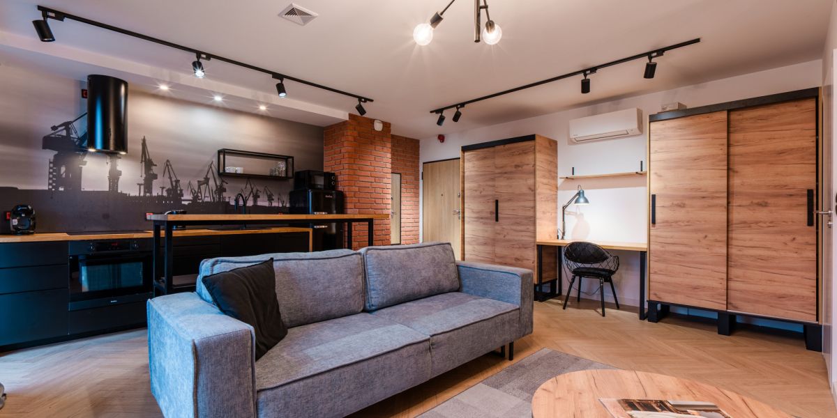 Przestronny salon z aneksem kuchennym - kuchnia z pełną zabudową i sprzętem AGD, wygodna, rozkładana kanapa, przestrzeń do pracy oraz dwie pojemne szafy.