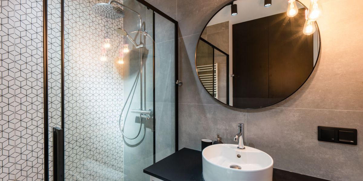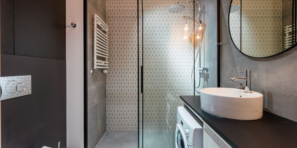 Łazienkę z prysznicem i nowoczesną armaturą.