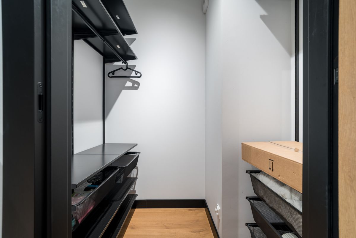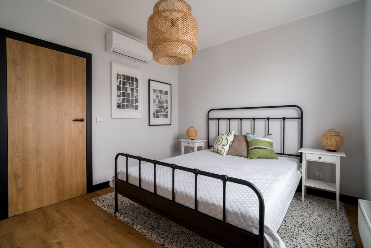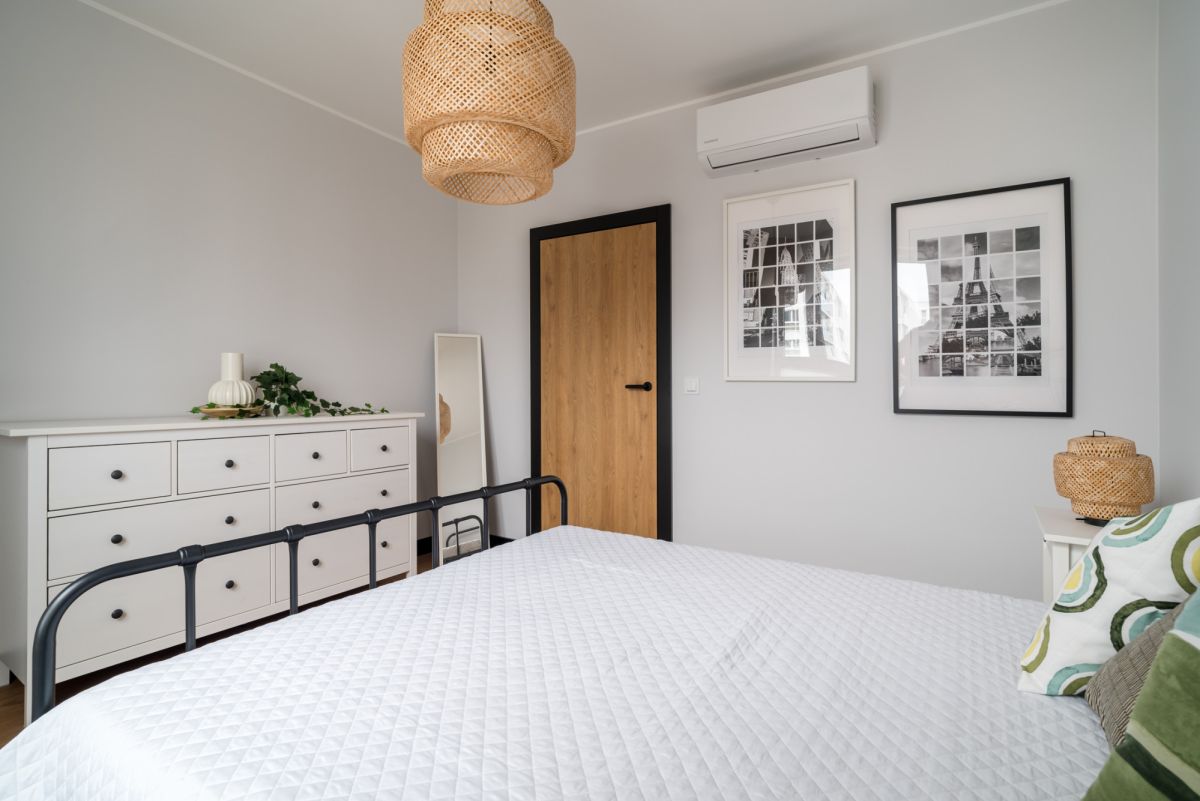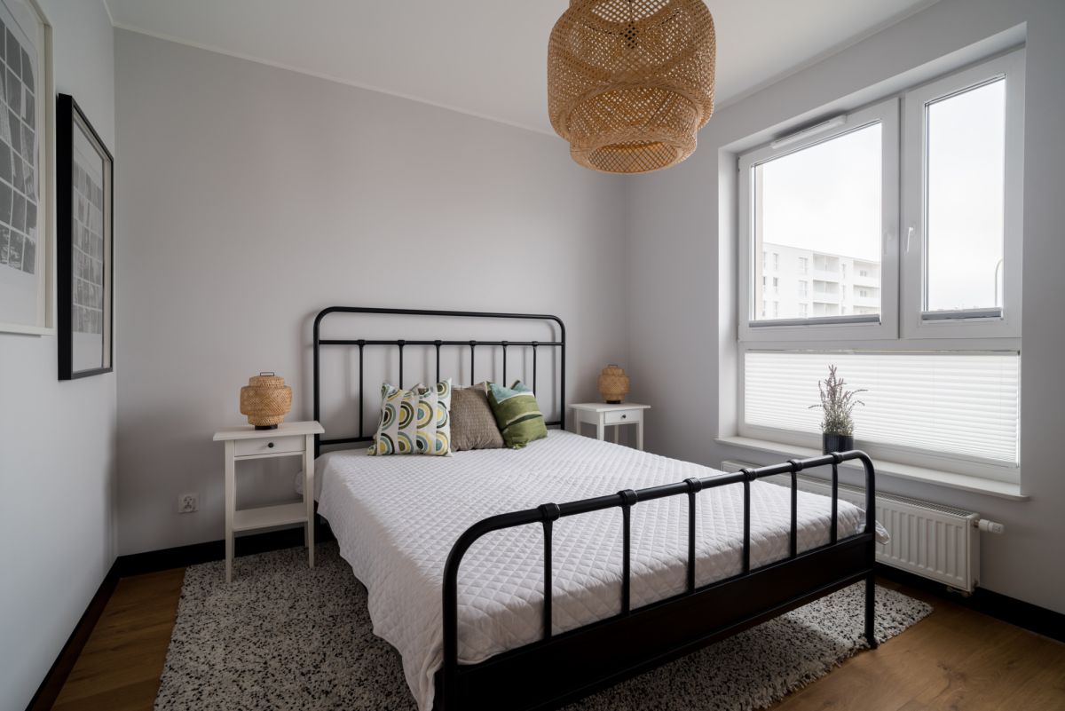 Duże okna wpuszczają mnóstwo naturalnego światła, a plisowane rolety pozwalają je subtelnie regulować. Pod stopami naturalna deska dębowa dodaje wnętrzu przytulności i klasy. Dodatkowym atutem jest funkcjonalna, przestronna garderoba, która pomaga utrzymać porządek bez kompromisów.