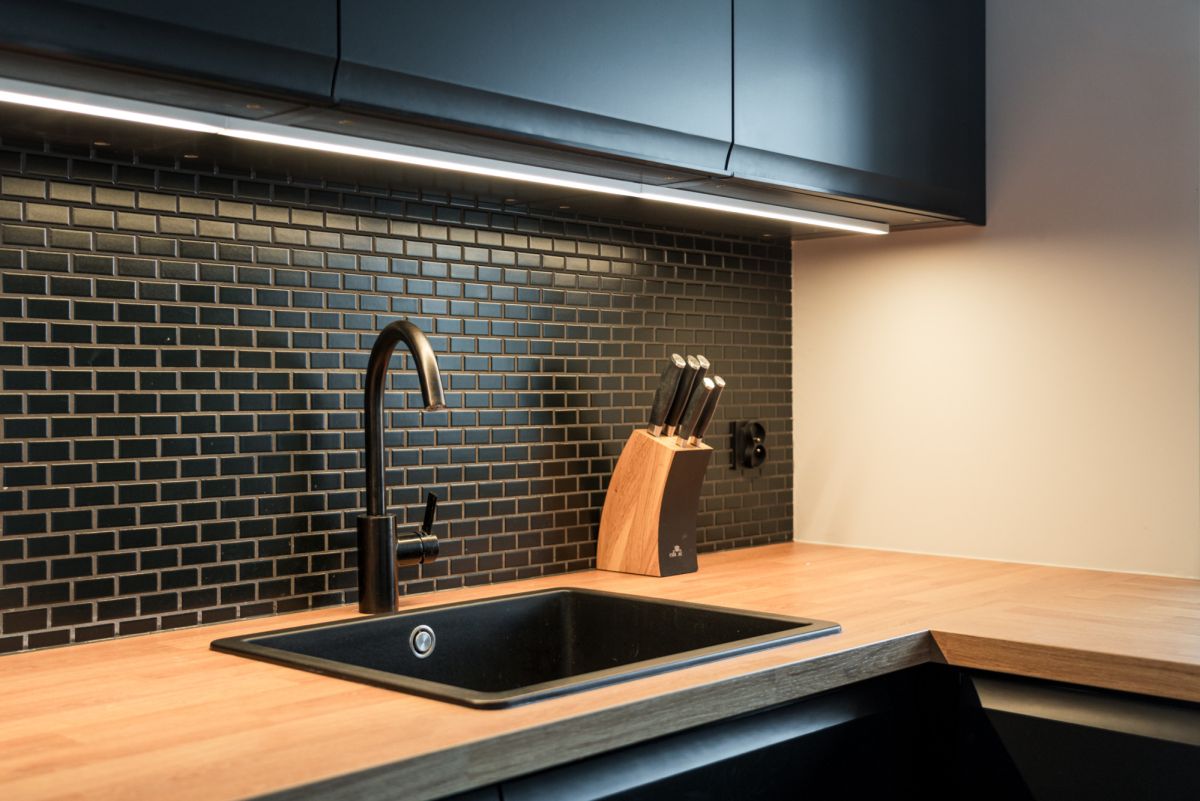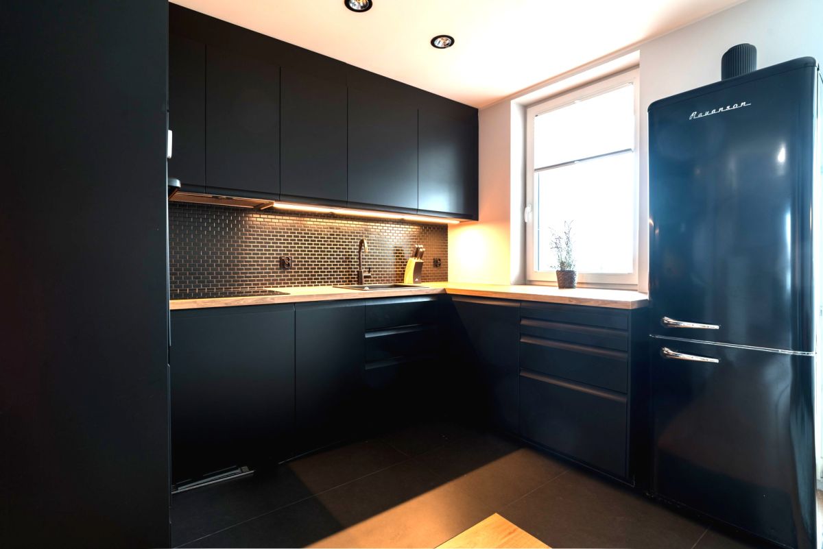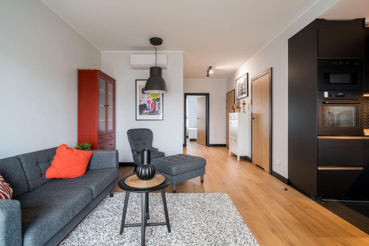 Serce mieszkania stanowi jasny salon z aneksem kuchennym. Kuchnia zachwyca nowoczesnym charakterem - czarne fronty szafek pięknie kontrastują z ciepłem dębowego blatu, a zabudowany sprzęt AGD (wciąż na gwarancji) zapewnia wygodę na co dzień. W części wypoczynkowej czeka komfortowa kanapa oraz stylowy fotel uszak z podnóżkiem - idealne miejsce na relaks po długim dniu.
