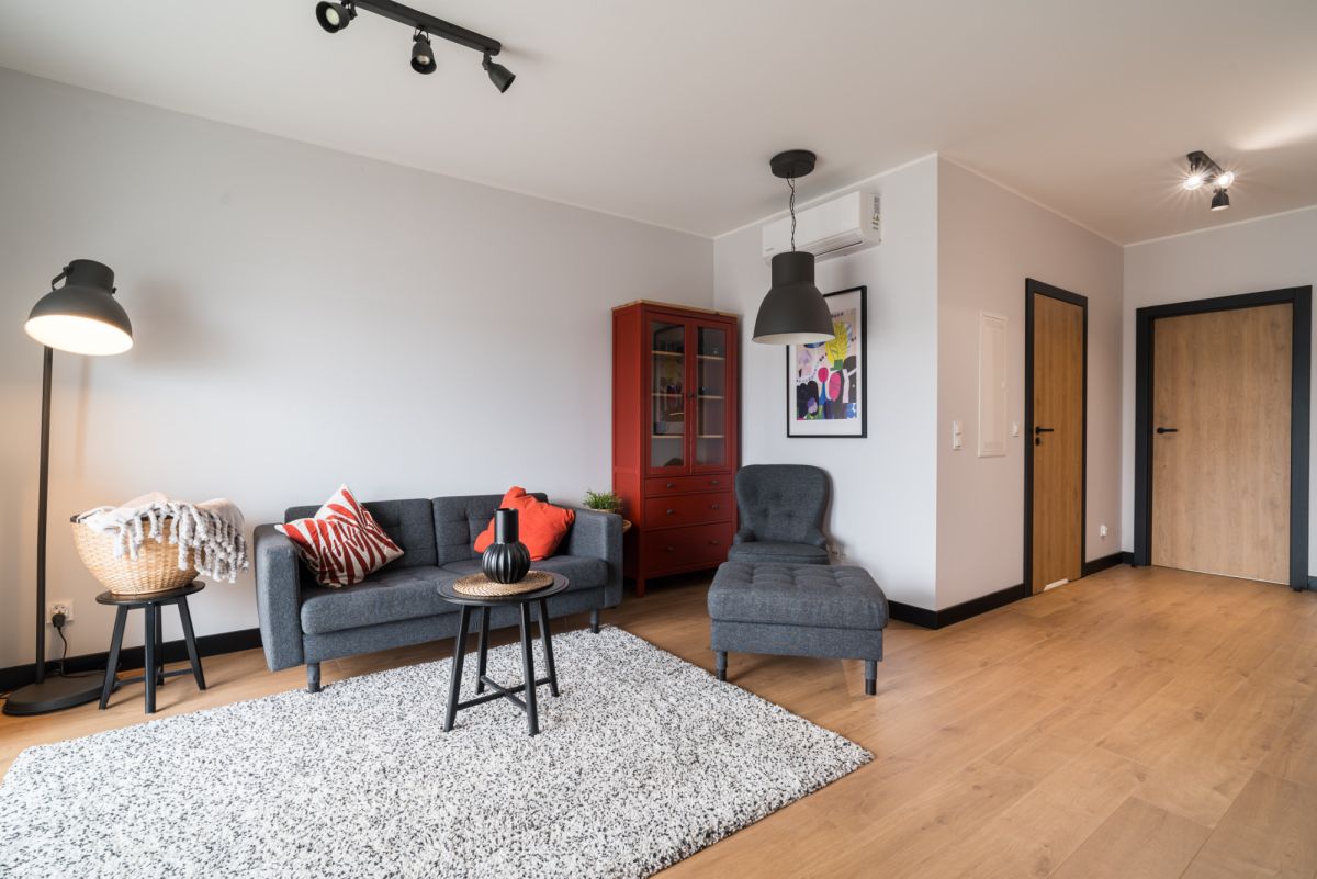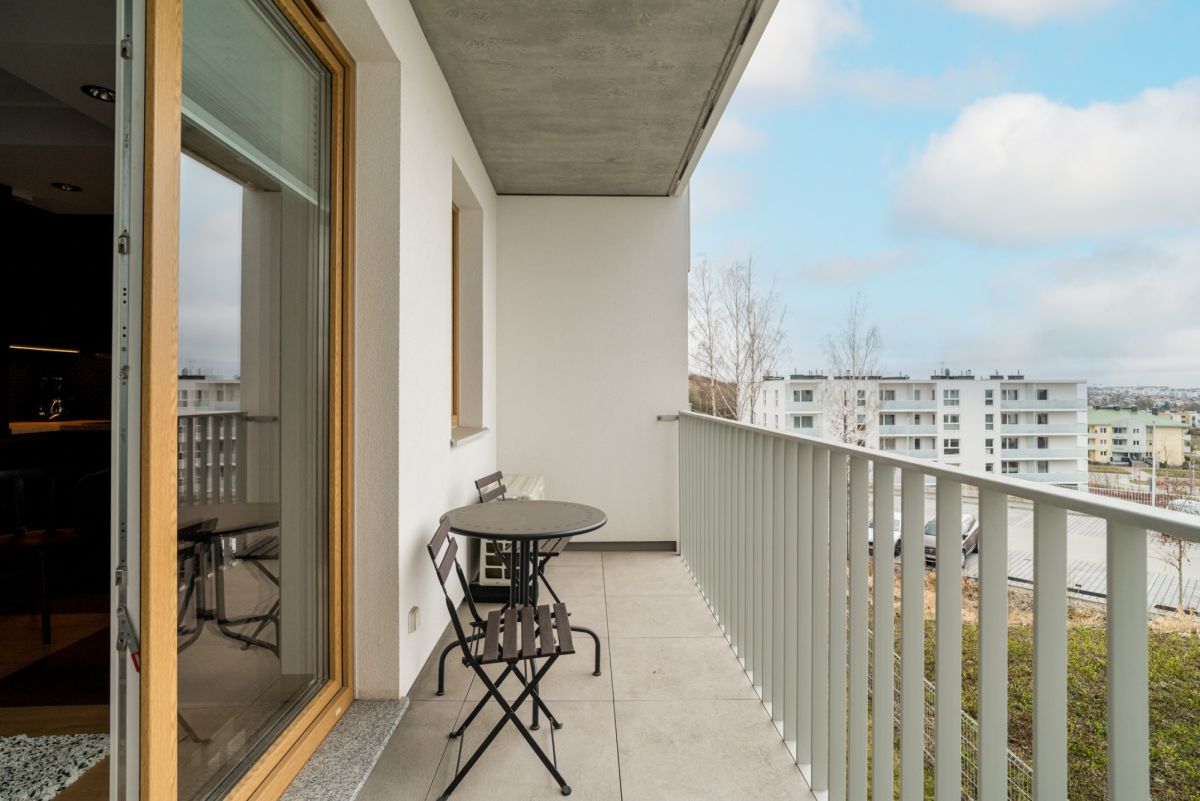 Mieszkanie wyposażone jest w klimatyzację, co znacząco podnosi komfort w cieplejsze dni. Z salonu wychodzimy na przestronny, 7-metrowy balkon - dodatkowo wyposażony w gniazdka elektryczne, co otwiera wiele możliwości aranżacyjnych.